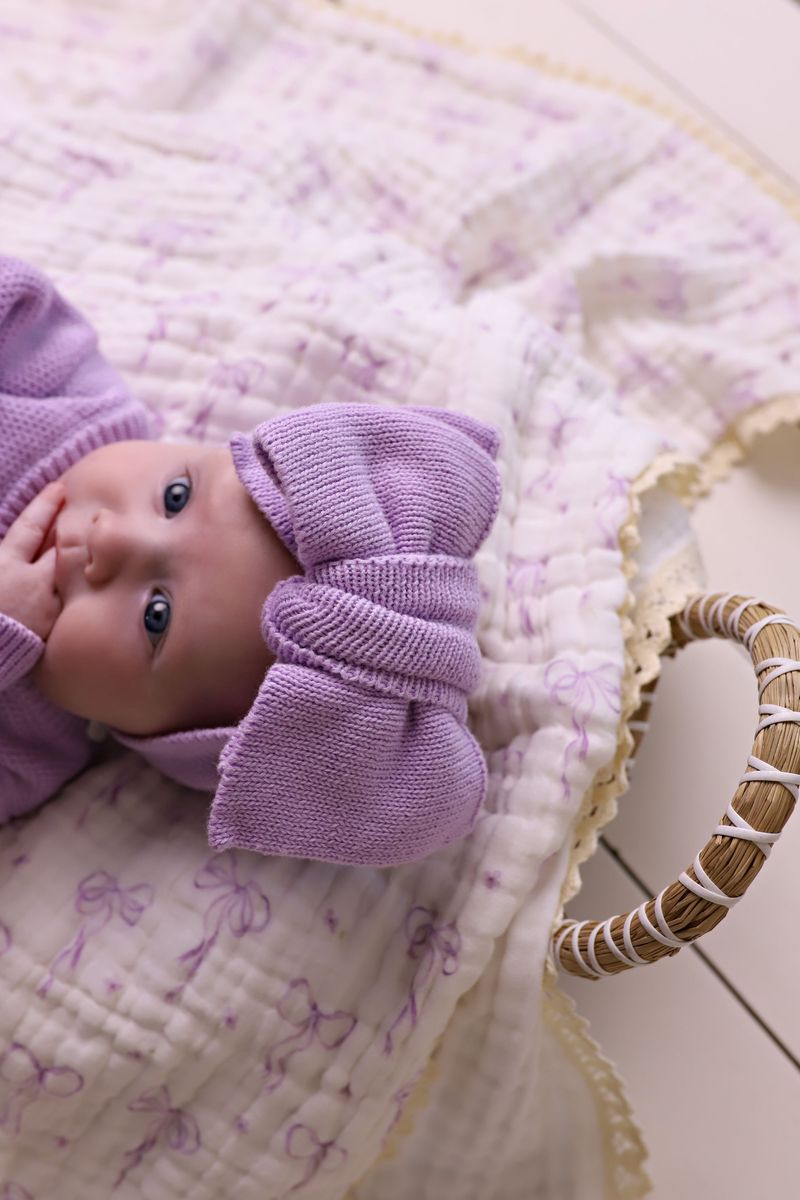 Our beautiful oversized pre-tied bow in a soft lilac is the perfect finishing touch to pair with our heirloom-quality announcement rompers. These come beautifully presented in gift-ready packaging.